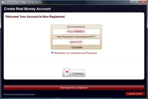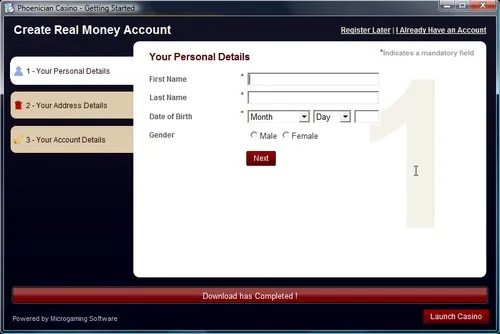 The Phoenician Casino software will now start to install. While the software downloads, you can register a real account or opt to use an existing account if you already have one.